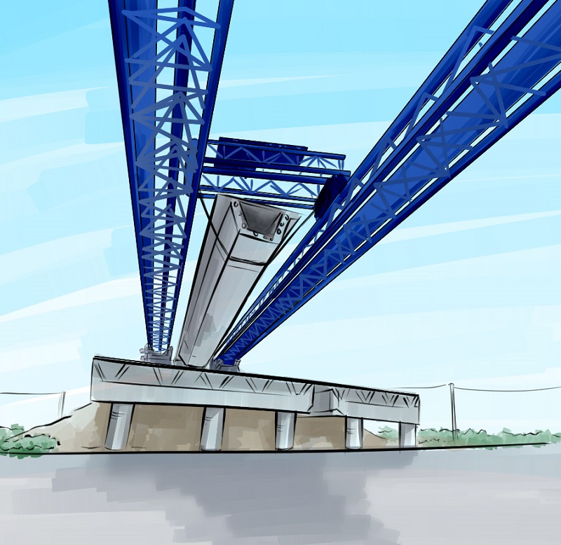 架橋機架設末跨橋時,對面是橋臺,架橋機前支腿必須在橋臺上運行,所以高度必須降低,本架橋機配備前支腿專門在橋臺是使用的底盤2,架設最后末跨時,可把前支腿中間部分整個拆下,把底盤